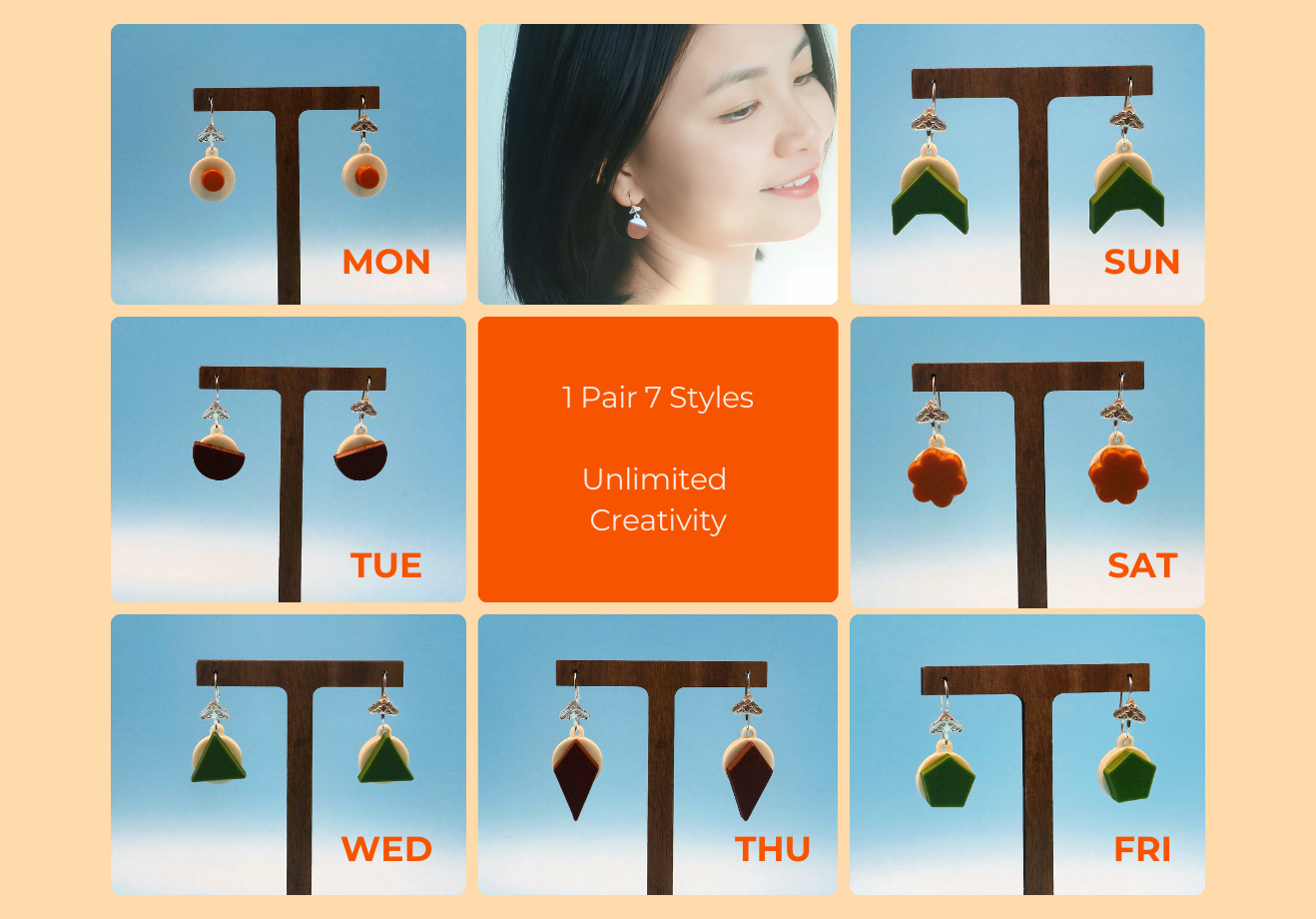 This is not your everyday earrings. With just 1 pair of stylish 925 silver hooks, you can easily switch up 7 looks with easy clip-on pendents, produced with eco-friendly PHA materials using low-carbon 3D printing technology.